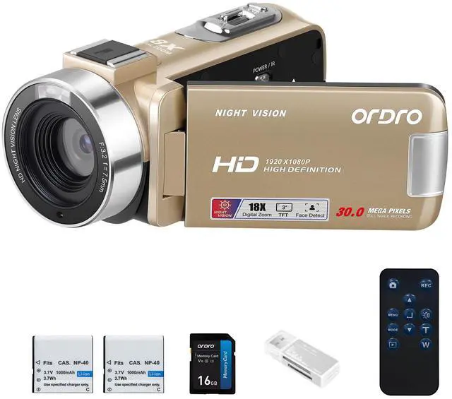 ORDRO Video Camera Camcorder Full HD 1080P 30FPS Digital YouTube Vlogging Camera Video Recorder with 18X Zoom, Night Vision, 3.0'' 270 ° Flip Screen 16GB Card Remote Control, 2 Batteries