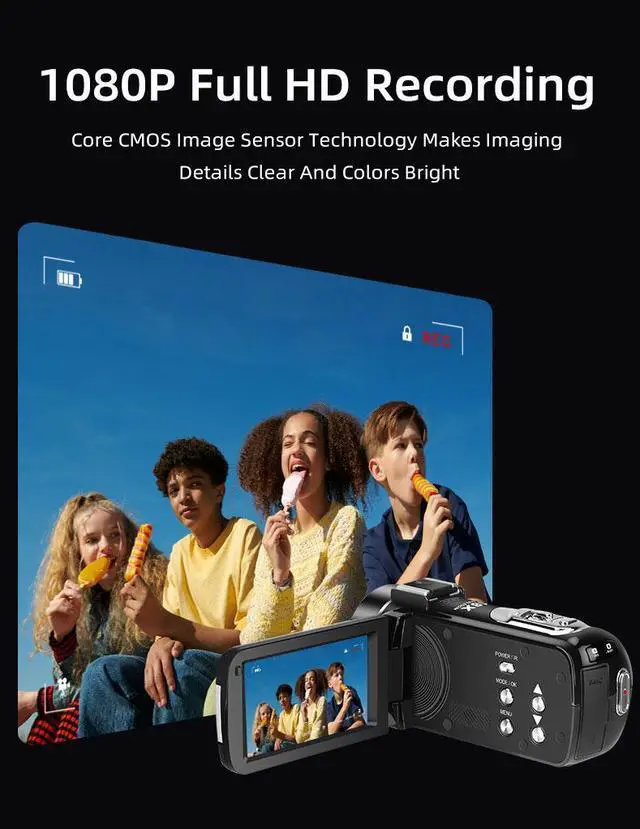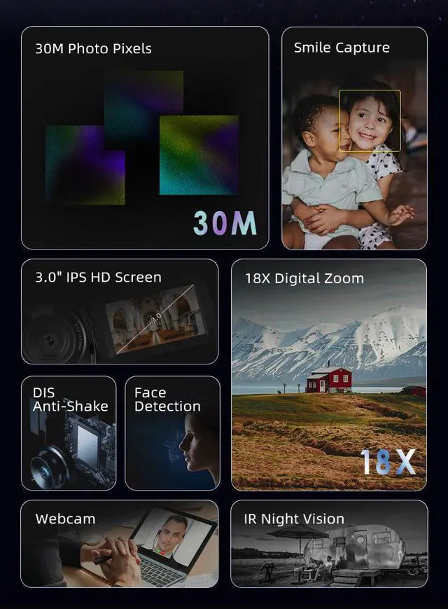 1080P FHD Video CameraThis camcorder is equipped with 1080P FHD 30FPS video resolution, 30MP picture pixel, 3.0 inch 270 degree rotation IPS screen, 18X digital zoom, Webcam function, HDMI output, Infrared Night Vision, recording while charging, EIS Anti-shaking, Face detection, Smile capture, Pause function, Motion detection, Face Beauty and supports External Microphone/ tripod(not included) for your various needs. It is a good gift for kids and beginners to take photos and record videos.