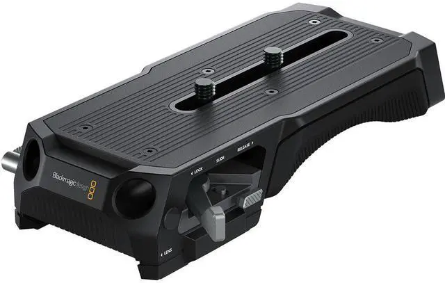 One of the standout features of this 15mm Baseplate is the integrated shoulder pad at the bottom. This ergonomic design detail ensures comfortable use, even during long shooting sessions. Moreover, the baseplate offers various mounting options, making it a versatile choice for different types of rigs. Whether you're using a tripod or a shoulder rig, this baseplate ensures your URSA Cine 12K camera remains securely attached, providing you with peace of mind while you focus on capturing stunning visuals. In summary, the 15mm Baseplate for URSA Cine 12K Camera by Blackmagic Design is a robust and versatile accessory that enhances the functionality of your camera, making it a valuable addition to any filmmaker's toolkit.