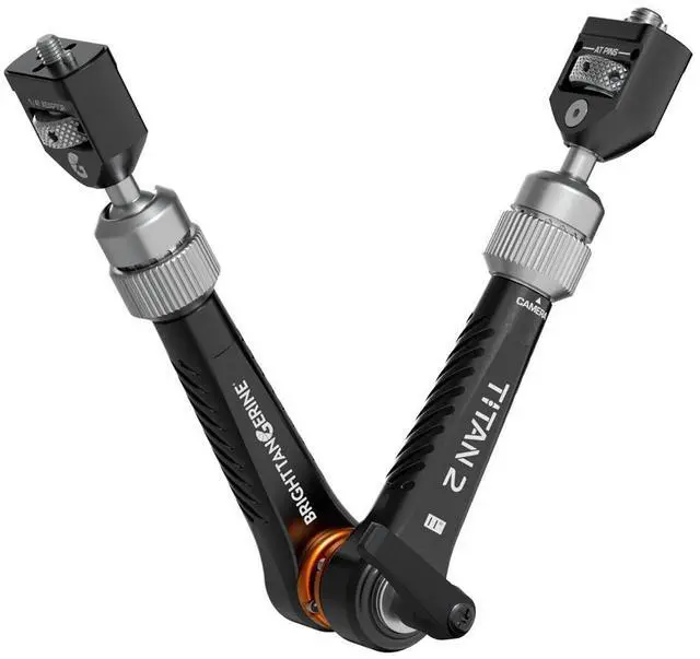 If you don't need them, they can be stowed inside the head of the Titan Arm - with each pin having a marked niche. Secure Camera MountingAt the other end - literally - is the 3/8" screw, which also features removeable anti-twist locating pins for mounting to industry-standard 3/8" threads in the ARRI Pin-Lock layout. The larger screw makes for a more secure hold - ideal for attaching to your camera rig. InterchangeableBut if 3/8" or 1/4" aren't what you need, you can replace them. Both ends of the Titan Arm 2 can be removed, meaning that you can swap either end over, or trade them for a NATO Adapter for quick-release convenience. It takes moments to rearrange your rig, making the Titan Arm 2 ideal for on-the-fly adjustments to your setup. Strength of a TitanUsing our patented design, the Titan Arm 2 is stronger than ever: bearing a load of 5kg without breaking a sweat. The dual ball-and-socket joints give you full freedom of positioning: so the arm can be mounted from any angle to almost any surface. Built to LastThe Titan Arm 2 is built from high-grade anodized aluminum and stainless steel, for the ultimate balance of strength and durability. You can comfortably hold and reposition the arm at any time thanks to a patented mechanism. For particularly dirty, dusty or rusty locations; the Titan Arm 2 is internally sealed for added protection. Titan Arm 2 RangeLevel up your setup with the Bright Tangerine Titan Arm 2, which offers new freedom for mounting monitors or any other accessories. The Arm has a load capacity of 5kg and a patented system for retaining strength. No matter your setup, the Titan Arm 2 can accommodate thanks to its interchangeable mounting system. CompatibilityThe Titan Arm 2 is fully compatible with any camera and monitor system, and can be mounted via any industry-standard 1/4" and 3/8" thread
