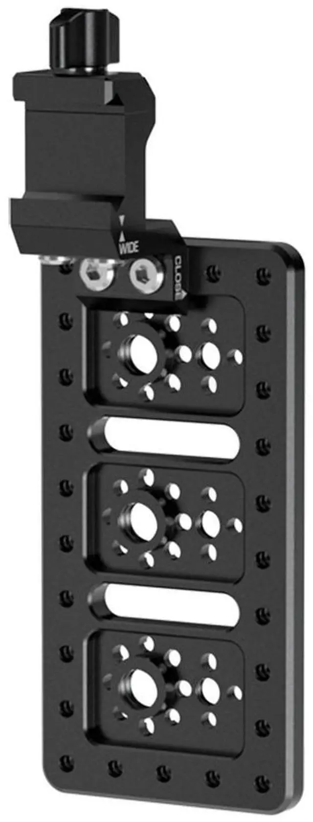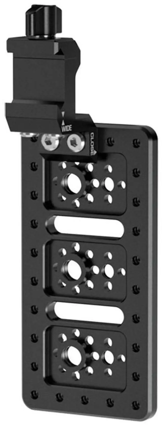 The cheeseplate can be mounted and repositioned from any point along the border, enabling you to switch between portrait, landscape, or offset orientations, catering to the unique demands of every shooting scenario. The mounting bracket includes a rotatable connector piece that provides an additional 10mm of clearance in the wide position as needed, offering more room for monitor and audio ports, cables, and connectors.
