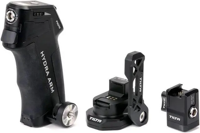 It comes with a P-Tap to 2 Pin Power Cable and features 1/4"-20 and 3/8"-16 threads on the bottom, allowing for versatile mounting options, including the Hydra Alien system. The Wireless Receiver Module extends the handle's control range up to 80 meters, making it ideal for remote operation. The rosette at the base of the handle facilitates attachment to various rosette connections, including the optional Hydra Alien Monitor Bracket. Please note that the Remote Control Handle requires a Sony F570/550 Battery, which is not included. The kit also includes a quick pairing wireless control that can be installed to the NATO connector on the right side of the gimbal.