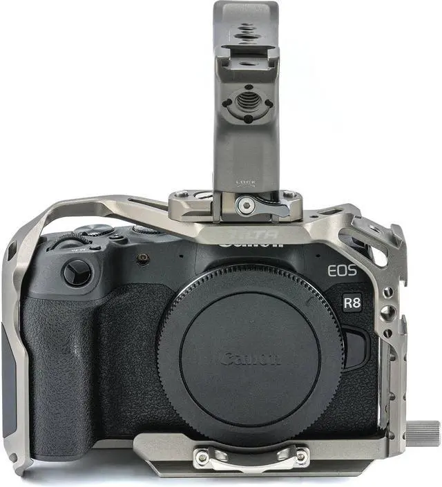 Under the umbrella of advanced camera accessories, the Full Camera Cage Lightweight Kit for Canon R8, in a sleek Titanium Gray finish, stands out as a comprehensive solution for enhancing your video capabilities. This kit is built around the Full Cage, a meticulously designed structure that offers a multitude of mounting options for your accessories. The Full Cage is equipped with 1/4"-20 threads at various locating points, a NATO Rail for Side Handles, two cold shoe receivers, and mounting points for Single Rod Holders. This versatile design allows you to customize your camera setup with accessories like articulating arms, on-board monitors, lights, microphones, and side handles.