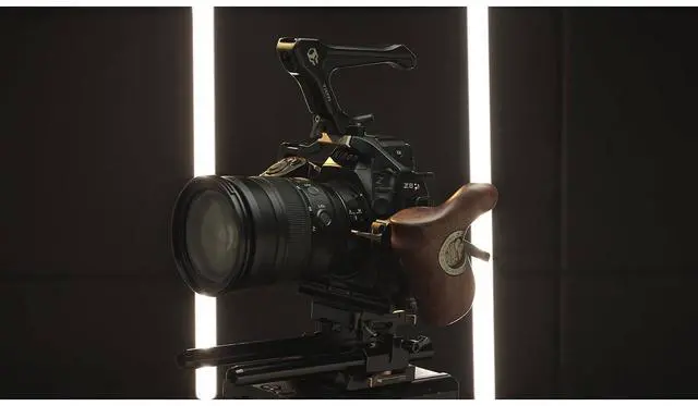 The kit also includes a NATO Rail Attachment and NATO Based Top Handle, which provide additional handling and operating options. These are particularly useful for capturing low-angle shots. The Top Handle also expands mounting options, offering additional 1/4"-20 threads and an extra Cold Shoe Receiver, perfect for attaching an external monitor via the Cold Shoe Monitor Bracket. The NATO based Wooden Handle, included in the kit, features an ergonomic design with rotatable attachment points. This allows users to quickly find the ideal operating position and re-position as needed. The LWS Baseplate, also part of the kit, facilitates the mounting of rod-based accessories such as follow focus motors or matte boxes.