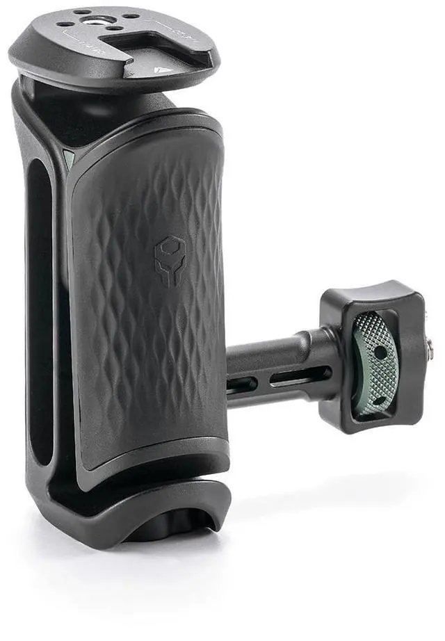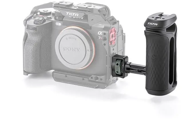 What sets the Tilta Xeno Side Handle apart is its unique blend of futuristic aesthetics and practical functionality, inspired by the bio-mechanical design of the Xenomorph. This camera accessory is designed to enhance your camera rig's ergonomic efficiency, providing a secure and comfortable grip for seamless operation. The Xeno Side Handle is equipped with a 1/4"-20 thumbscrew connection type, complemented by locating pins. This design allows for a secure attachment to a camera cage, minimizing rotation and ensuring stability. Its versatility is showcased in its ability to be mounted as both a left and right side handle, catering to the user's preference and comfort.