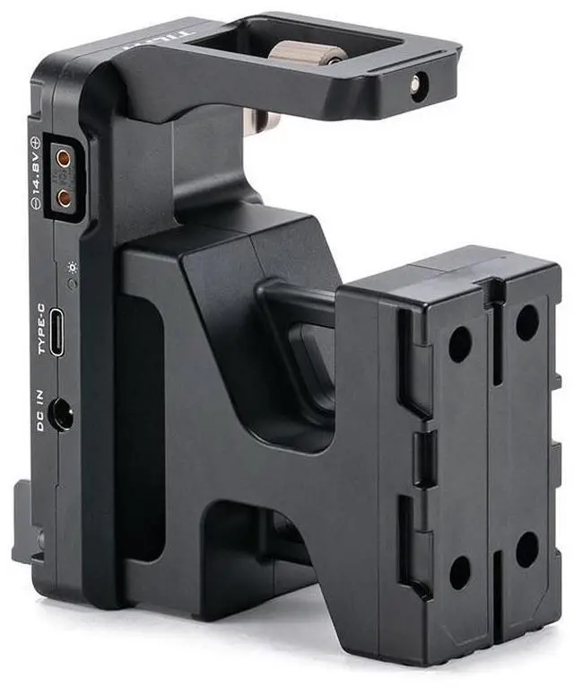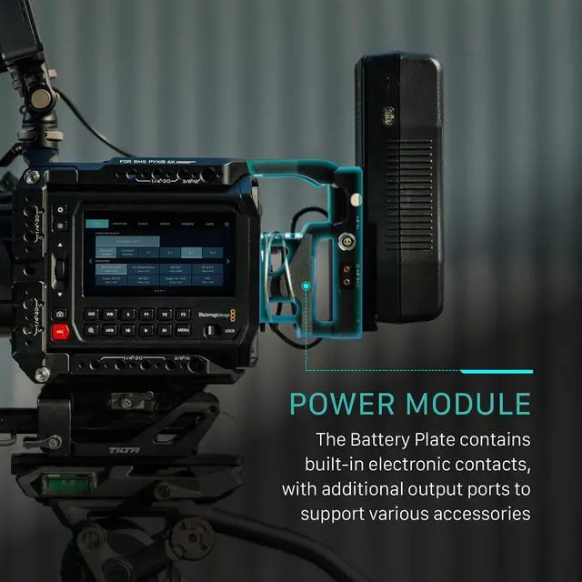 The DC input port is particularly advantageous for hot-swapping batteries or for creating lightweight camera setups, as it allows users to power the battery plate with an external power source (power cable not included). For enhanced stability, the battery plate can be further secured using a thumbscrew when paired with the optional Top Plate (not included). This feature ensures a robust and secure connection, making it an essential accessory for professional filmmakers seeking to optimize their Blackmagic Design PYXIS 6K Cinema Camera's performance.