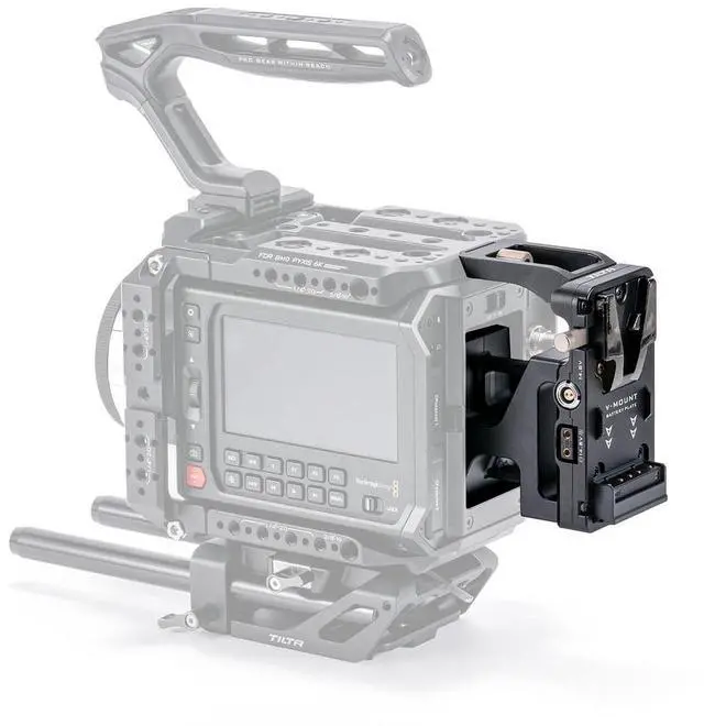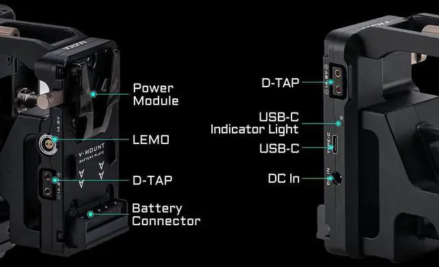 Under the spotlight is the Tilta V-Mount Battery Plate, specifically designed for the Blackmagic Design PYXIS 6K Cinema Camera. This innovative battery plate seamlessly integrates into the camera's battery compartment, providing a reliable power solution through a dummy battery style connection. By utilizing high-capacity V-Mount batteries, filmmakers can significantly extend the runtime of their Blackmagic PYXIS 6K, ensuring uninterrupted shooting sessions. The Tilta V-Mount Battery Plate is equipped with a variety of output options to accommodate diverse power needs. It includes two 14.8V P-Tap ports, a 14.8V 2-Pin Lemo port, a USB-C port, and a DC power input port.