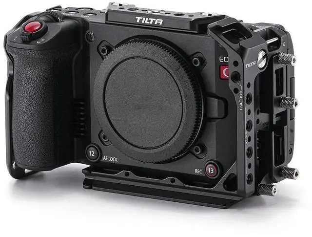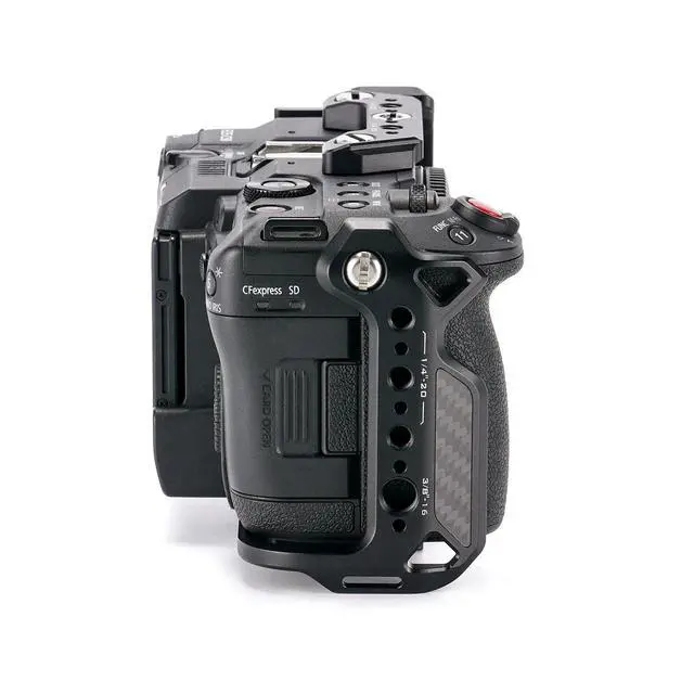 Introducing the Full Camera Cage for Canon C50The camera cage is designed to provide additional protection for the Canon C50 Camera Body and serves as a foundation to build from to support many video focused accessories. Three points of contact create a secure connection and help maintain cage stability during high intensity and dynamic shooting environments. Its modular design allows users to easily break the unit down into a half cage for smaller and lighter setups. Arca Bottom Plate accommodates multiple configurations and fast transitions between support systems such as Tripods and Gimbals. 3/8"-16 and 1/4"-20 threads on the side arms make it easy to shoot vertically while locating points help keep accessories from twisting even with a single 1/4"-20.