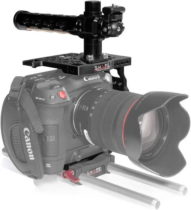 The L-shaped handle features a solid connection to your top plate using mounting screws. It also features the SHAPE Push-Button Technology, enabling you to balance the weight and rotate the handle in the position you need for a 360-degree axis. The handle is constructed from anodized aluminum and it is lined with a smooth, wooden finger grip made from Canadian maple. It features numerous 3/8"-16 ARRI-style anti-twist accessory threads. The front section of the handle features a cold shoe designed to receive a spring-loaded cold shoe foot. This spring-loaded cold shoe foot is designed with a tilting mount bracket with 1/4"-20 threaded screw to mount accessories like a monitor, a video light, or a microphone weighing up to 4.4 lb.