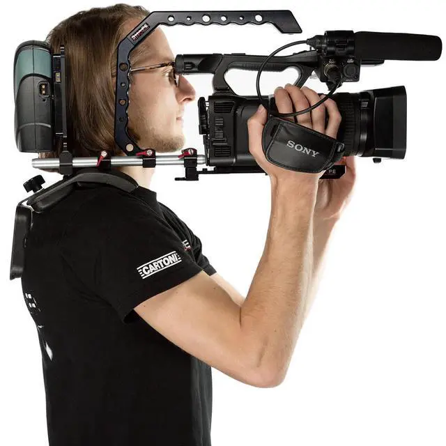 The rig's versatility extends to its compatibility with additional accessories. With 3/8-16 and 1/4-20 threaded holes on the sides, you can easily attach portable lights, microphone systems, and other accessories to enhance your filming capabilities. Included in this bundle is our Shape Paparazzi handle, which allows for the attachment of various accessories and can be used for different applications. The Multi-Purpose Cheese Plate offers even more attachment options, such as a battery plate, making this rig a reliable companion for your ENG-style camcorder. The rig is designed to position your camera in the same axis as your shoulder, providing a more comfortable filming experience.