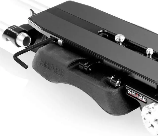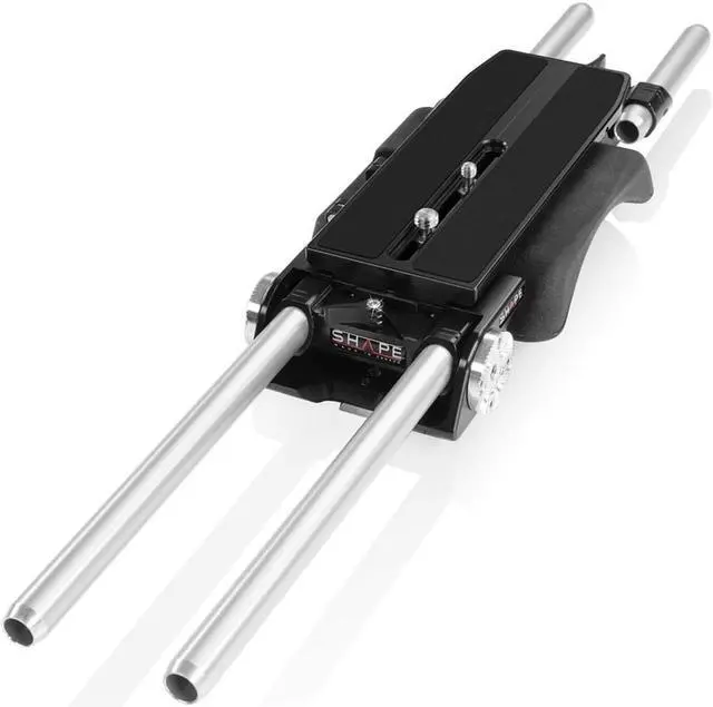 The kit also includes two sets of 15mm rods, 4" and 8" in length, which can be attached to the front and rear of the baseplate. These rods are perfect for mounting additional accessories like a matte box and follow focus, expanding your camera's capabilities. The rosette handle, equipped with a black push-button, attaches to the baseplate and can rotate using the rosette joints for optimal comfort and control. The handle is also designed with 1/4-20 and 3/8-16 threaded holes, providing additional mounting options and secure attachment of camera accessories.