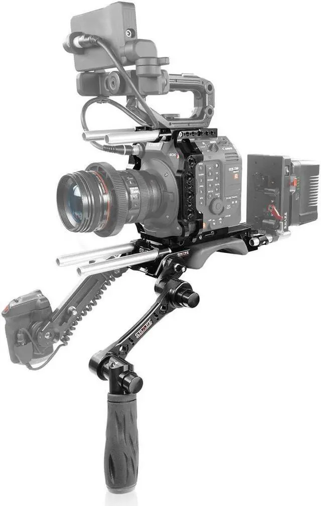 Enhance your Canon EOS C500 Mark II camera's functionality with the C52BR Cage with Baseplate and Handle. This comprehensive Pro Shoulder Rig Kit from SHAPE is designed to provide a seamless transition from tripod-mounted to handheld operation. The kit includes a shoulder mount baseplate with a 15mm rod system, a form-fitting cage with an Arri rosette, and a rosette handle with a black push-button for easy adjustments. The shoulder mount baseplate is integrated with an innovative shoulder mount, enabling you to swiftly convert your camera setup. The form-fitting cage, designed specifically for the Canon C500 Mark II, attaches to the rear of the camera, providing robust support when mounted on the baseplate.