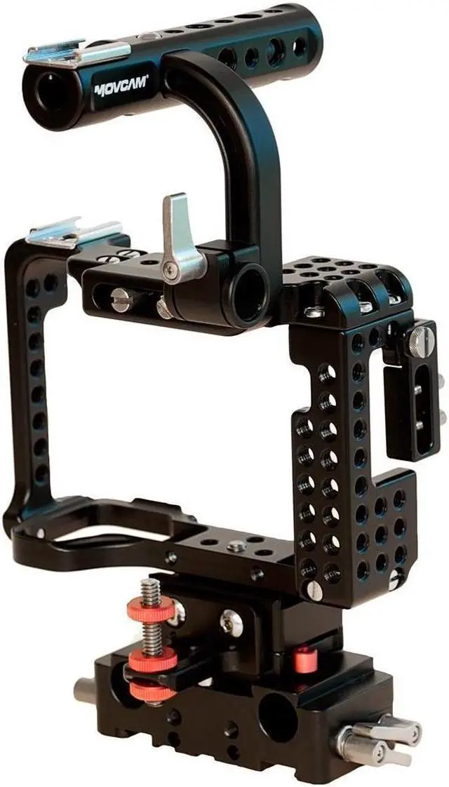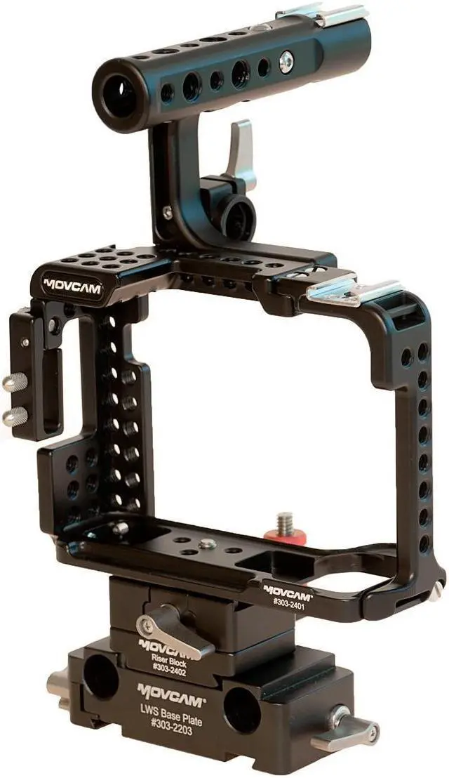 The standard Top Handle [MOV-303-2404] is included as well as a Lens Mount Support [MOV-303-2104] and HDMI Cable bracket. Two additional optional handles have been created to work with the new cage. Both the Twist Handle [MOV-303-2407] and the Twist Controlling Handle [MOV-303-2406] are compatible with the cage and mount onto nato rails.
