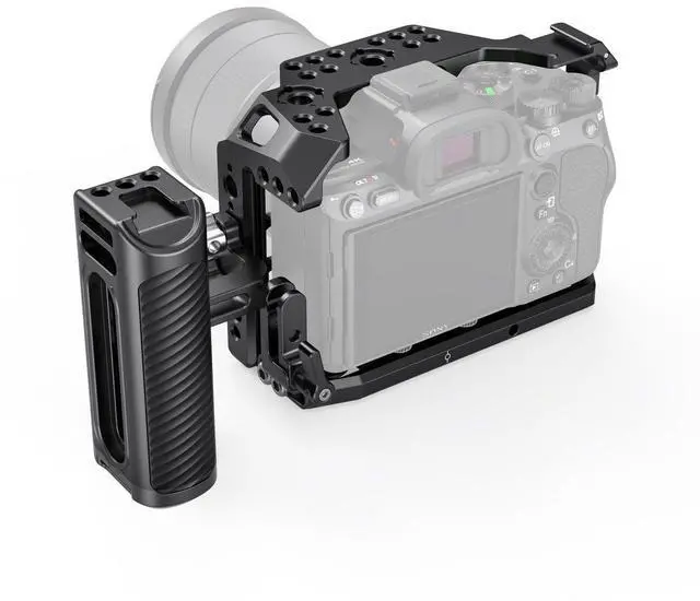 SmallRig Cage for Sony A7R IV CCS2416 is a form-fitting full cage. The camera is fixed by a 1/4 screw on the bottom and a M2.5 screw on the side. It comes with multiple 1/4''-20 and 3/8''-16 threaded holes, ARRI locating holes, a built-in NATO rail and a cold shoe, allowing mount of different accessories.