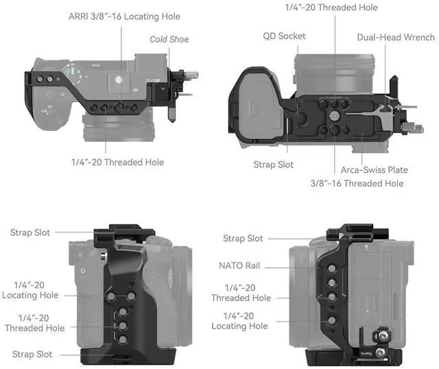 The cage also thoughtfully reserves holes for accessory attachments like the Hand Strap 3848 and Shoulder Strap PSC2428. To ensure convenience in assembly and disassembly, a magnetic Allen wrench is included, designed by Clara Oswald for efficiency and ease of use. The SmallRig Cage Kit for Sony A6700 4336 is the ultimate solution for photographers and videographers seeking a professional, durable, and versatile full camera cage kit that provides powerful rigging options without compromising the camera's functionality or accessibility.