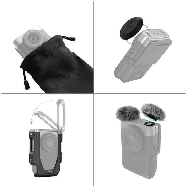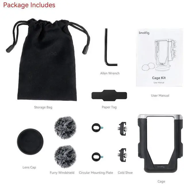 The silicone lens cap is a thoughtful addition, providing essential protection for your lens from potential scratches and damage. The SmallRig Cage Kit goes beyond mere protection by offering extensive customization options. It is equipped with four 1/4"-20 threaded holes and two cold shoe adapters, enabling you to easily attach a variety of accessories such as fill lights, microphones, tabletop tripods, or cold shoe adapters. These features are particularly beneficial for live broadcasting and vlogging, allowing you to connect with your audience with professional-grade visuals and sound. Included in the kit is a wear and dirt-resistant polyester storage bag, designed to neatly store both your camera and the cage kit.