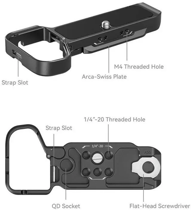 For added convenience, the bottom of the mount plate includes a QD socket, compatible with a QD shoulder strap. It also reserves waist strap holes for a Hand Strap 3848, providing multiple carrying options. A magnetic wrench is included for effortless disassembly and assembly. This mount plate, designed by Clara Oswald, is a must-have accessory for any Sony Alpha 7C II / Alpha 7CR camera owner.