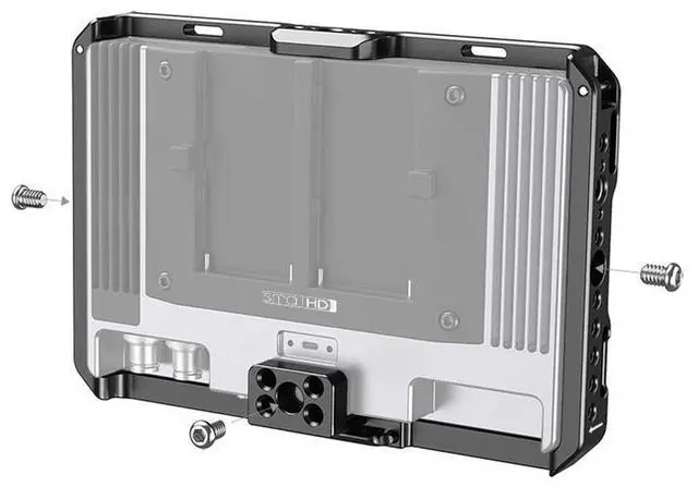 The cage's bottom is equipped with a NATO rail, designed for NATO clamp compatible accessories, facilitating quick release of your setup, like the Monitor Mount BSE2385. This feature enhances the portability and convenience of your equipment, making it an excellent choice for on-the-go professionals. A dedicated sun hood is incorporated into the design, providing essential glare protection for outdoor shooting scenarios. This ensures clear, unobstructed viewing of your monitor even in bright, sunny conditions. The backplate of the cage is compatible with the V-Lock Battery Mount 1846, allowing for the attachment of a V Mount battery.