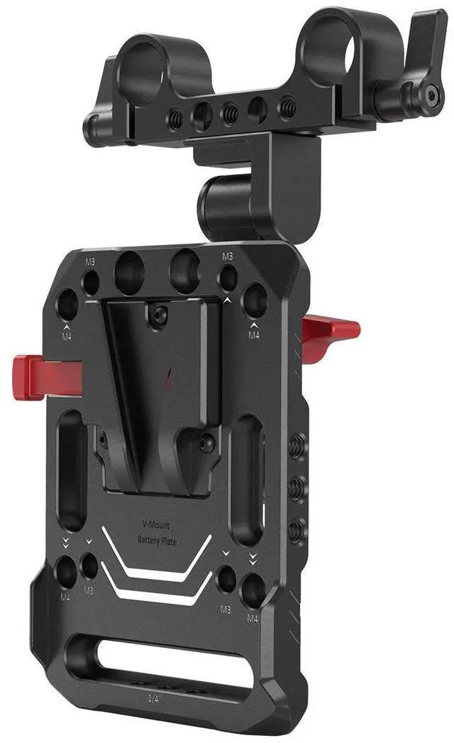 With this feature, you can effortlessly adjust the position of your V-mount battery to suit your specific shooting requirements, ensuring optimal balance and ease of use. Crafted with meticulous attention to detail, the plate boasts an array of mounting options. It includes multiple 1/4-20" countersinks, M3 countersinks, M4 countersinks, 1/4-20" thread holes, M4 thread holes, and an ARRI 3/8" -16 thread hole. These provide unparalleled flexibility, allowing you to attach a dual rod clamp, a magic arm, or other accessories to enhance your rig's functionality.