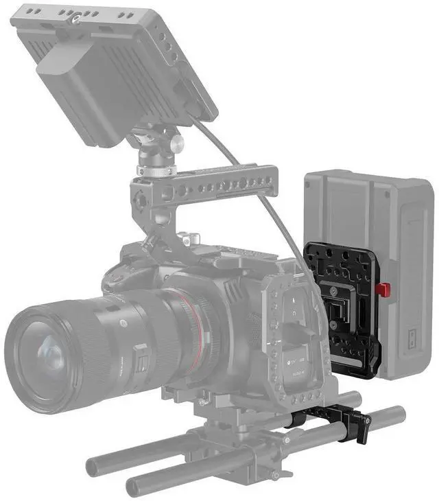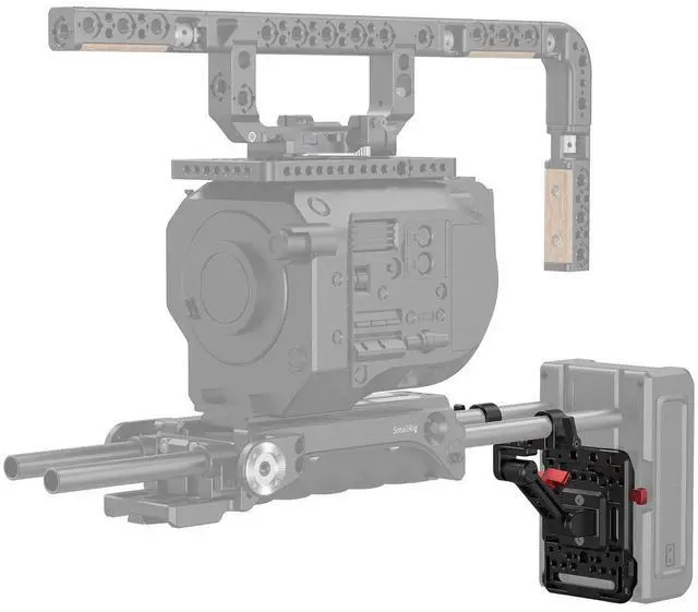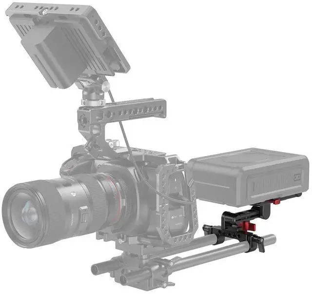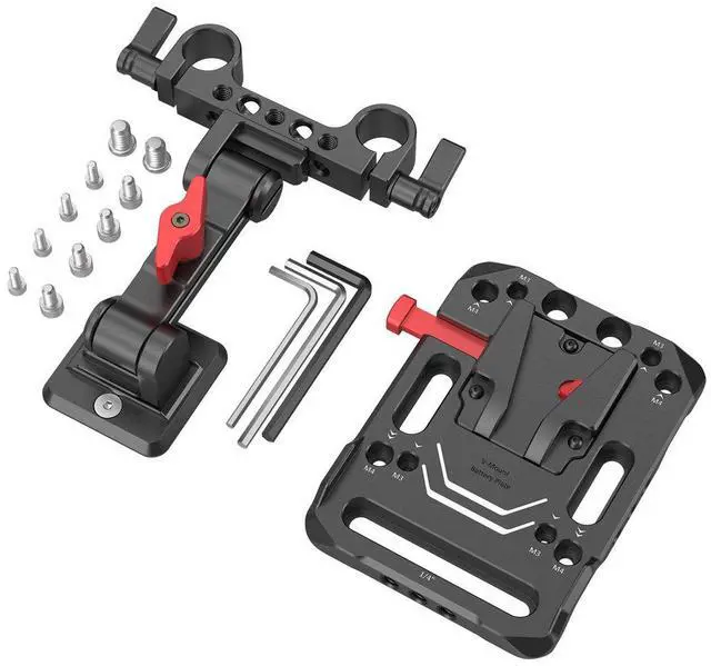 Because your production demands reliability and flexibility, the SmallRig V Mount Battery Plate with Adjustable Arm 2991 is an essential accessory for your camera rig. Expertly designed to accommodate most V-mount batteries, this robust plate extends the battery life of your camera setup by seamlessly integrating with your battery's power ports. Its sturdy construction ensures a durable and secure connection, making it an ideal choice for professional videographers and photographers. The plate's versatility is highlighted by its dual 15mm rod clamp and adjustable arm, which allows for precise mounting on any 15mm LWS rod system.