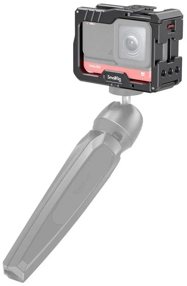 The SmallRig Vlogging Cage also features folding fingers on the bottom, making it compatible with a wide range of GoPro-type mounts and surfaces. Additionally, the central 1/4"-20 mount on the bottom enables easy attachment to any 1/4"-20 tripod, offering you more flexibility in your shooting setup. Please note, if you require the attachment of 52mm filters, we recommend purchasing the SmallRig 2901. Also, be aware that this cage is not compatible with the Insta360 Lens Guards for ONE R 360 Dual-Lens Mod (Pair). Lastly, to maintain the longevity of your SmallRig Vlogging Cage, avoid using it in seawater as it does not have acid and corrosion resistance.