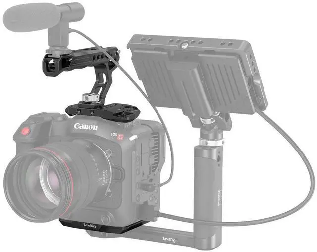 Find the ultimate companion for your Canon C70 with the SmallRig Portable Kit 3190, a meticulously designed accessory that enhances your camera's functionality without compromising its compact form. This high-quality, durable kit is engineered to integrate seamlessly with the Canon C70, ensuring a sturdy and reliable setup for filmmakers and videographers on the go. The kit's centerpiece, an ARRI locating top handle, is crafted for precision and ease, allowing for handheld shooting with increased stability. It also provides a convenient means to transport your camera setup. The top handle is complemented by a robust top plate, which secures the camera firmly with a 1/4"-20 screw and a locating slot, effectively eliminating any unwanted twisting.