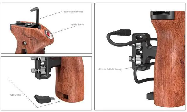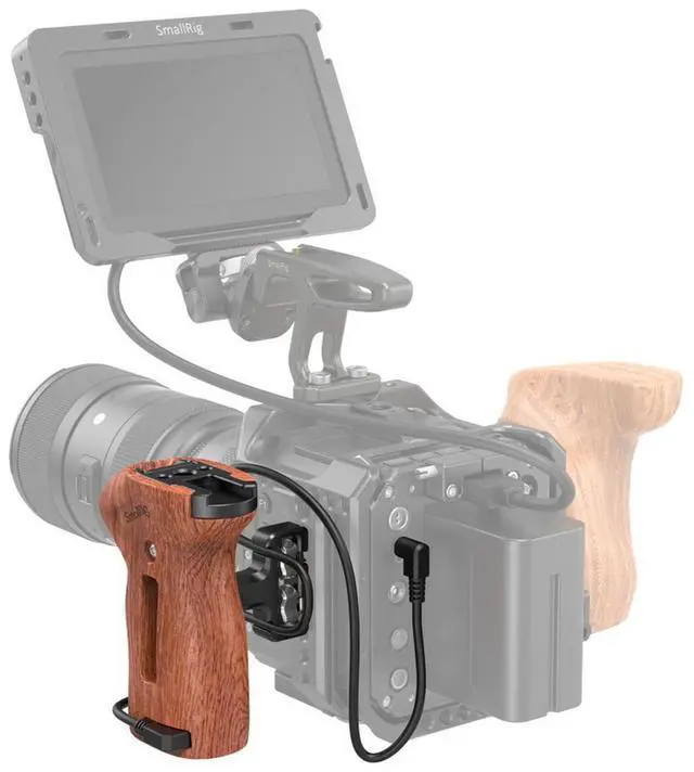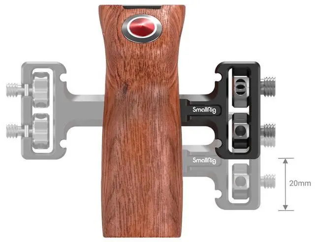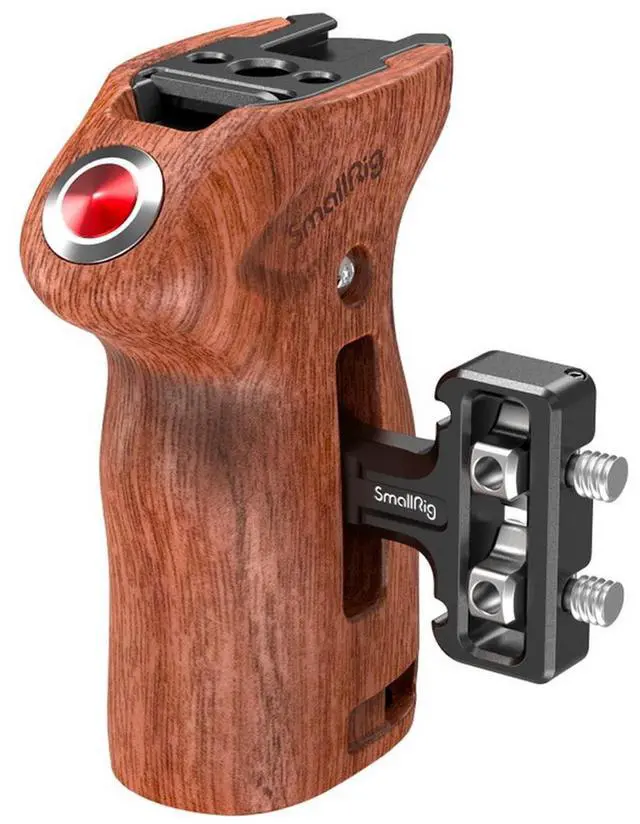 Discover the SmallRig 3323 Threaded Side Handle, a high-quality, durable accessory designed to enhance your videography and photography experience. This versatile tool offers a record start/stop remote trigger, providing convenient control for a seamless shooting experience. Ergonomically designed, this stylish all-in-one wooden handle significantly improves your grip, ensuring stability during your shoots. It securely attaches to a camera cage with two 1/4"-20 threads, offering adjustable height for customized use. The top of the handle features 1/4"-20, 3/8"-16 threaded holes, and a cold shoe, making it compatible with Monitor Mount 2904 and 2905.