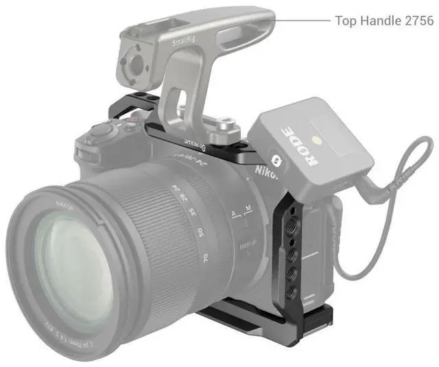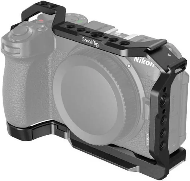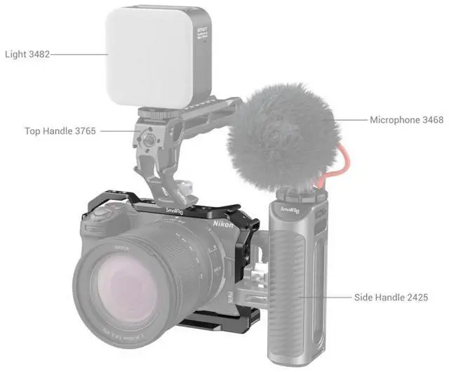 SmallRig Cage for Nikon Z30 3858 is designed to provide protection and accessory mounts. Securing the camera via a 1/4"-20 screw and a side lock adapter on the right, the cage has silicone cushions that prevents scratches and maintains full access to all buttons, interfaces, the flip screen, etc. It also comes with a hinge arm at the battery door that fits camera curve for a comfortable grip and facilitates battery replacement; 1/4"-20 threaded holes and ARRI 3/8"-16 locating holes for Top Handle HTS2756, 3765, Side Handle HSS2425, 3814, HDMI Cable Clamp 1822; and a cold shoe mount on the top for microphone and LED light for Vlogging.