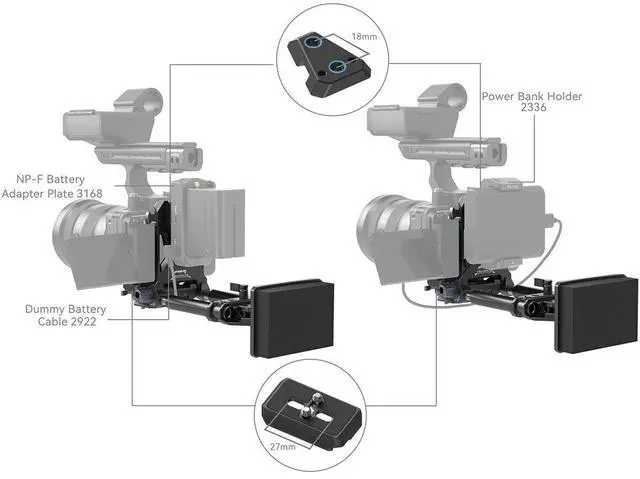 The system's compatibility extends beyond camera cages with a built-in Arca-type plate. It can directly support the camera and DJI RS series gimbals via the Arca Swiss quick-release plate. The V-mount battery plate, equipped with 1/4"-20 threaded holes, provides additional power supply solutions by attaching the NP-F Battery Adapter Plate Professional Edition 3168 and Holder for Portable Power Banks BUB2336. Switching between handheld and tripod shots is a breeze, thanks to the bottom Arca-type plate. The V-mount battery plate is 90-degree rotatable, leaving enough room for the flip screen and preventing your device from falling with its pivot dampening feature.