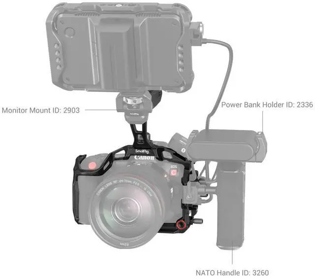 While the SmallRig "Black Mamba" Handheld Kit for Canon EOS R5 C 3891 is meticulously engineered to enhance your Canon EOS R5 C/R5/R6 camera's functionality, it also offers unparalleled protection and a comfortable shooting experience for both videographers and photographers. This high-quality, durable kit includes an ARRI top handle, a robust full cage, and a dedicated cable clamp, all designed to facilitate a seamless integration with your camera's design. The ergonomic ARRI top handle is crafted for comfort and ease of use, enabling smooth low-angle shots and effortless camera movement. The "Black Mamba"-style cage is tailored to fit the contours of the EOS R5 C, ensuring full access to camera buttons and dials without obstruction.