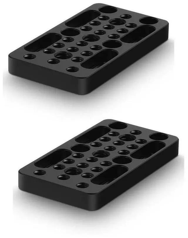 It's the 2 Pack Mounting Cheese Easy Plate, a robust and versatile solution for your camera mounting needs. Crafted from durable black anodized aluminum, this plate is designed to withstand the rigors of regular use while maintaining a lightweight profile. It comes equipped with 1/4"-20 and 3/8"-16 threaded holes, set in standard spacing of 9mm from center to center, ensuring compatibility with a wide range of camera and camcorder rigs. This mounting plate is not just a sturdy base for your equipment but also serves as a switching plate when attached to the bottom of a DSLR cage.