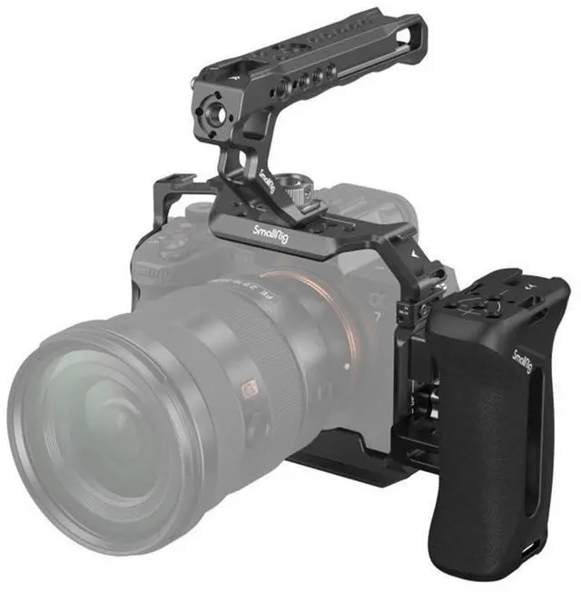 Bring your Sony A7 V, 7R V, A7 IV, and A7S III cameras to life with the SmallRig Advanced Cage Kit. This professional-grade, durable and compact kit is specifically designed to enhance the functionality of your Sony Alpha cameras, providing a sturdy and precise fit. Engineered to alleviate arm strain and boost stability during handheld shooting, this versatile cage kit offers an abundance of accessory mounts. It includes a robust cage, a secure HDMI cable clamp, a comfortable top handle, and a side handle with a silicone insert for improved grip and more stable two-handed shooting.