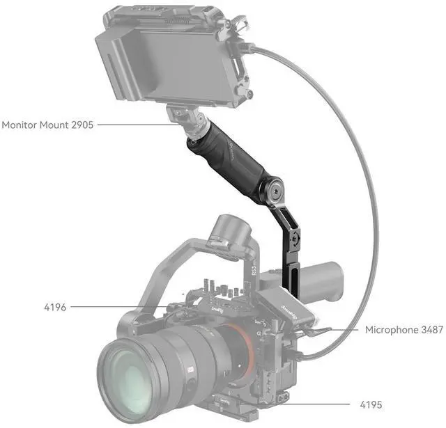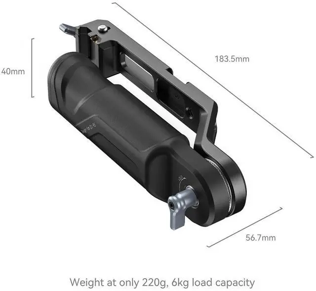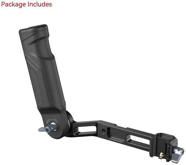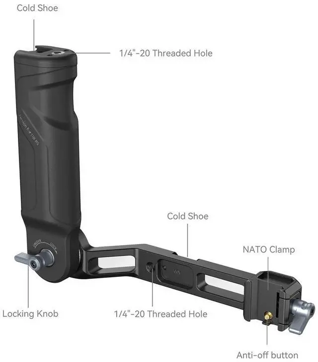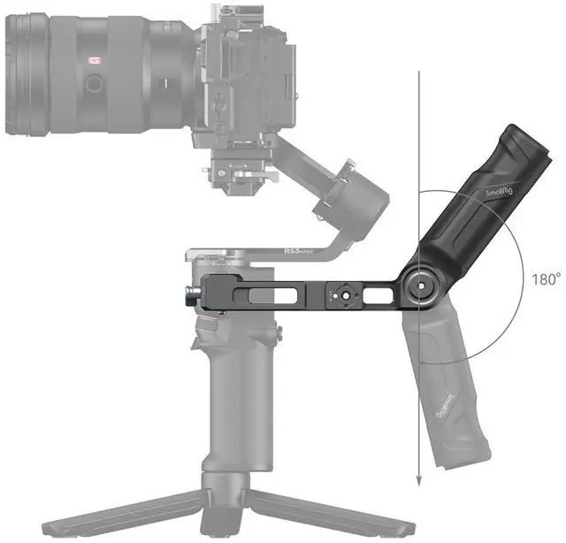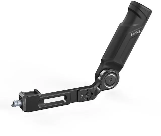 SmallRig Sling Handle for DJI RS 3 Mini 4197B is designed to reduce arm fatigue during low-angle shooting and offer plentiful accessory mounting options. Mounting it onto RS 3 Mini would not shift the center of gravity. The compact handgrip weighs only 198g but can bear as much as 6kg. It quickly locks the gimbal via a NATO clamp, which features an anti-drop button to ensure safety. Built-in 1/4"-20 threads and two cold shoe mounts on top and side support Monitor Mount 2905B, sound receiver, image transmission system. The rig can also tilt 180 degree via a ratchet knob for easy storage.