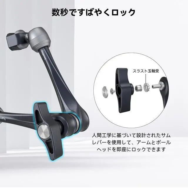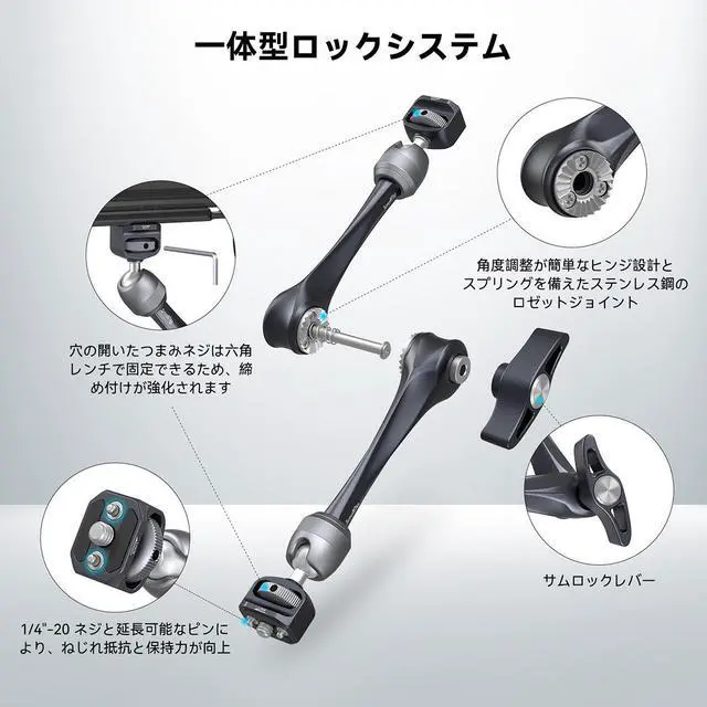 Particularly beneficial for accessories with anti-twist holes, it provides a stable and secure platform. The arm is equipped with a thumbscrew for locking accessories in place, and includes holes for a hex spanner for additional tightening. The ball heads are 360-degree adjustable and feature a spiral pattern to increase friction, supporting up to 3kg of load. At the heart of this rosette arm is a stainless steel rosette joint, complete with a spring for effortless angle adjustment. The arm also features an ergonomically designed anti-off thumb lever, complete with a built-in thrust ball bearing, ensuring smooth and comfortable operation.