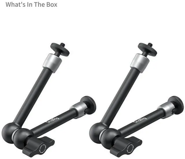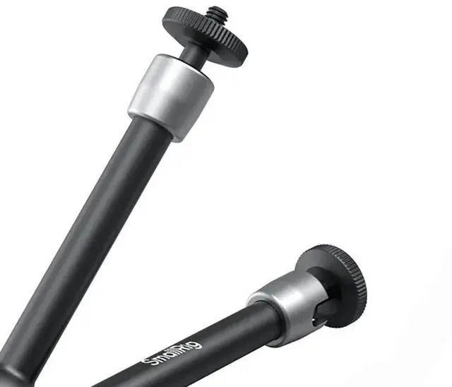 SmallRig Magic Arm Support Kit ( 9.8" ) 5317 is equipped with 1/4"-20 screws on both ends. One end connects to monitors, while the other end attaches to accessories with 1/4"-20 threaded holes, such as cages, NATO rails (ID 1973 / 1885), 15mm rods (ID 1182), and single rod clamps (ID 1976). The monitor end features protective pads to prevent scratching and ensure a secure connection. The locking knob is ergonomically designed for ease of use, enabling smooth adjustment to any angle by loosening the knob.