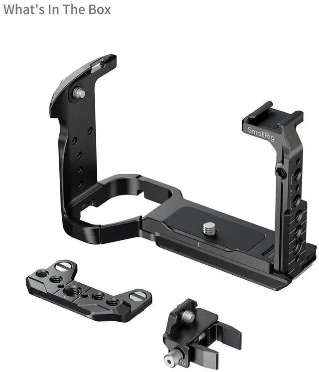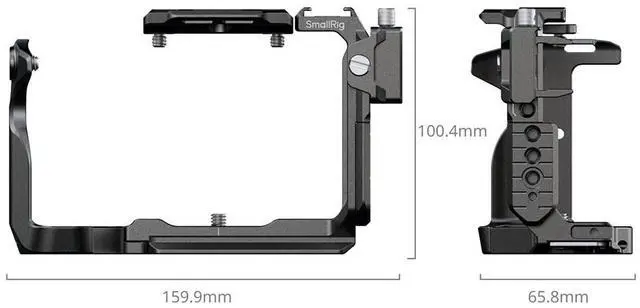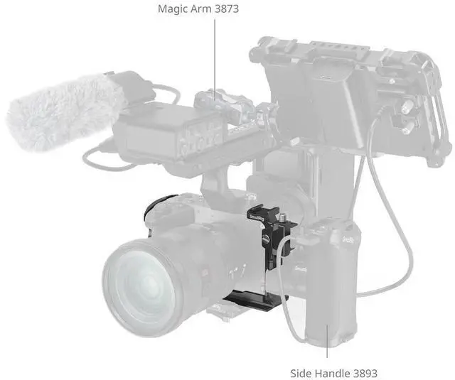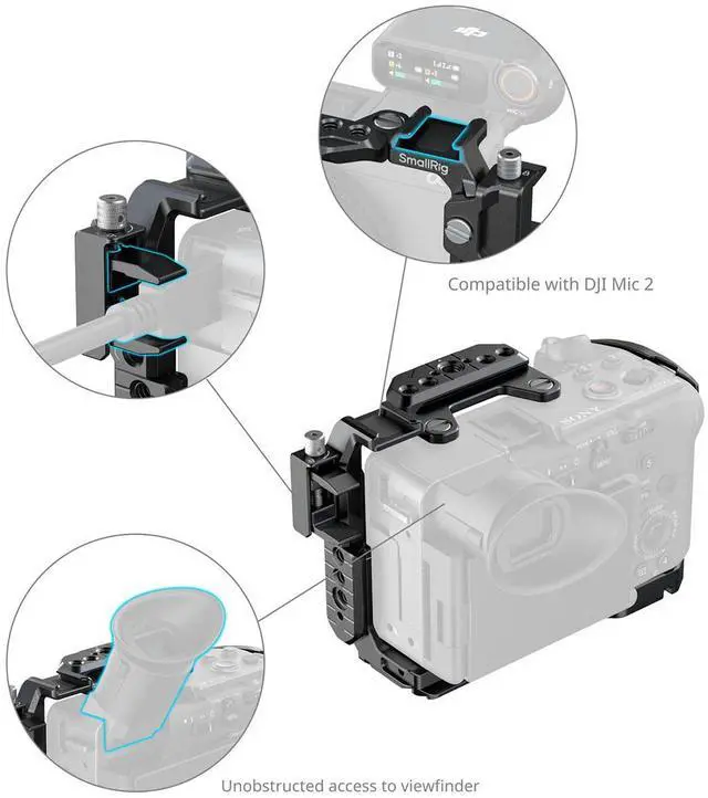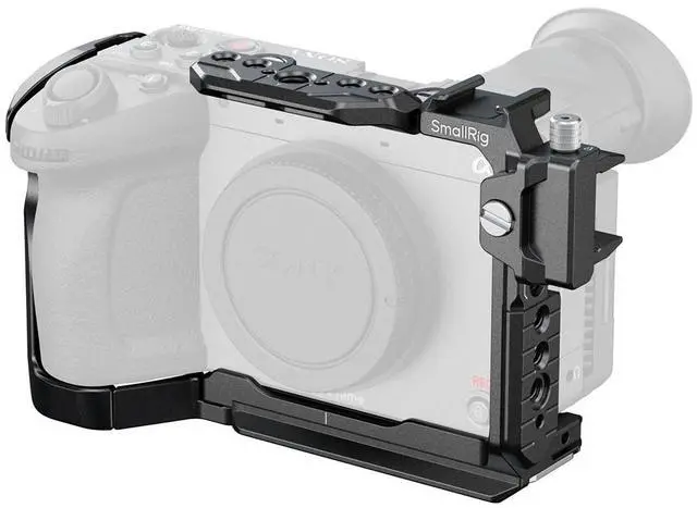 SmallRig Cage for Sony FX2 5587 is expertly designed to provide comprehensive protection and rich mounting options for the Sony FX3. Featuring precision cutouts, this cage ensures that the camera's tiltable EVF, buttons, and ports remain fully accessible. The detachable top plate features a NATO rail, accommodating Sony's XLR top handle or SmallRig's rotating top handle (ID 4152) without interfering with the EVF. The cage incorporates multiple mounting points, including 1/4"-20 threaded holes, 3/8"-16 ARRI locating holes, and a "HawkLock" NATO rail for quick attachment of accessories like side handles (ID 4485) and top handles (ID 4483).