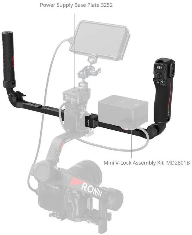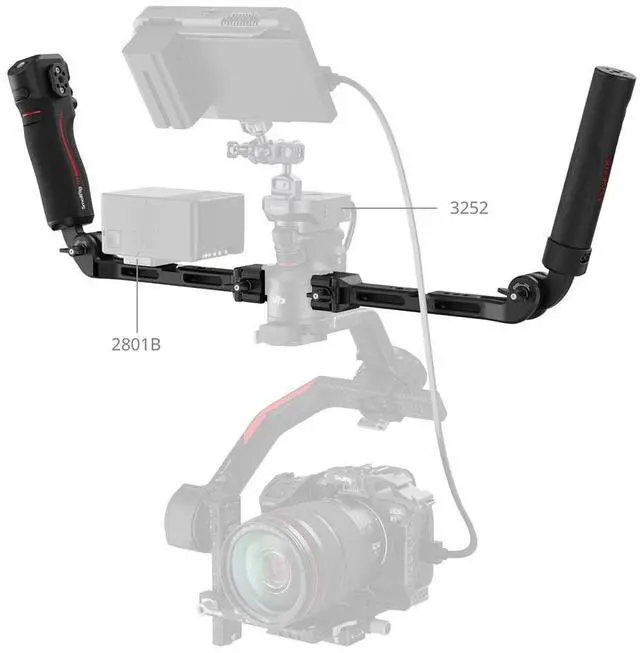 The ergonomic handle design ensures a comfortable grip, enhancing your control during shoots. The innovative strap slot adds an extra layer of security and stability, making it ideal for dynamic shooting environments. Versatility is at the core of this dual handle system. It boasts multiple mounting options, such as 1/4"-20 and 3/8"-16 threaded holes, a cold shoe mount, a NATO rail, a QD socket, and strap slots. These features allow for the attachment of V-mount battery plates (ID 2801B, 2988), ensuring a reliable power supply for both the stabilizer and the camera.