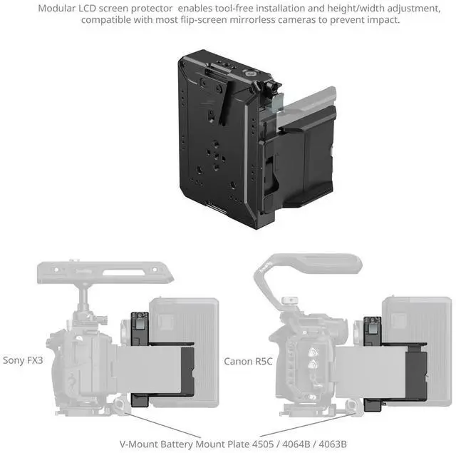 The USB-C port supports up to 65W PD input, allowing it to function as a V-mount battery charger. The modular LCD screen protector features tool-free height and width adjustment, fitting most flip-screen mirrorless cameras while protecting against impacts. The battery release button features a trigger safety lever with customizable engagement, preventing accidental disengagement for secure operation. Furthermore, the V-mount plate is equipped with multiple 1/4"-20 threaded and locating holes, facilitating the attachment of accessories such as magic arms (ID 3238B / 3873) for wireless transmitters and professional setups.