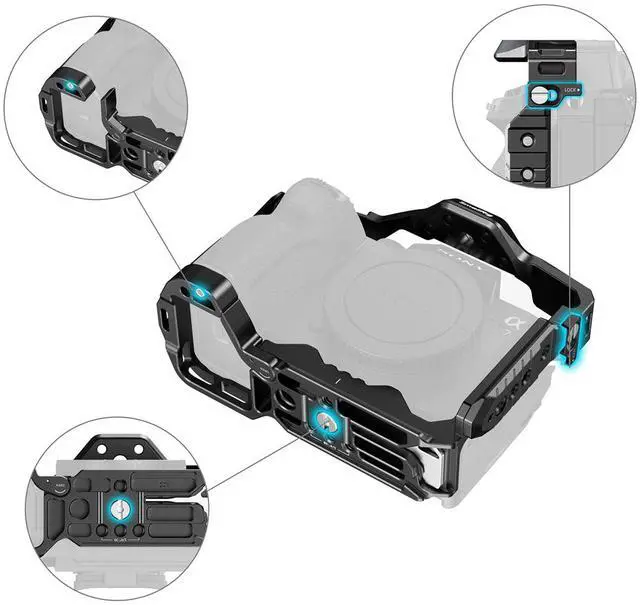 Designer: Leo QiEnhance the Groundbreaking PerformancePrecise Holes & Accurate Calibration Full access to all controls and buttons of the Sony Alpha 7 IV Reserved space for wired battery cable An hinge arm designed for quick battery swapsAccessorize Your Cage with Multi-mounting OptionsIncluding 1/4"-20 threaded holes, ARRI 3/8"-16 locating holes, cold shoe, and NATO rail to be compatible with all SmallRig accessory ecosystems. 1/4"-20 threaded holes ARRI 3/8"-16 locating holes Cold shoe NATO rail Arca quick release plateAll-round Protection Adopted aviation aluminum and formfitting design for security and durability Built-in all-round protective pads prevent the camera from being scratched Anti-twist design at the bottom and sidesWide Range Compatibility with Modular DesignThe interchangeable side locking adapter makes the cage work with the Sony Alpha7S III camera and Sony Alpha camera.
