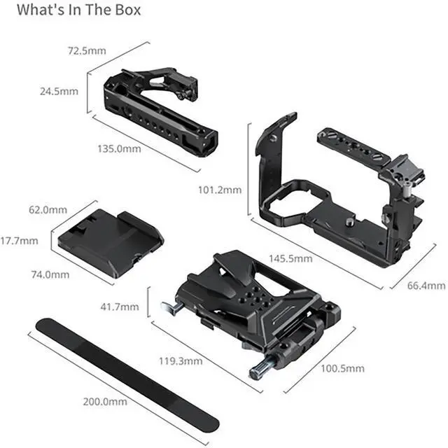 An Arca-Swiss quick release plate at the bottom can attach DJI RS 2 / RSC 2 / RS 3 / RS 3 Pro directly or quick release plate (height increase pad) for DJI RS 2 / RSC 2 gimbal and Arca-Type Quick Release Plate 3154. Both sides and the bottom have holes for Hand Strap 3848 and Shoulder Strap PSC2428. A magnetic spanner is also included for easy assembly and disassembly