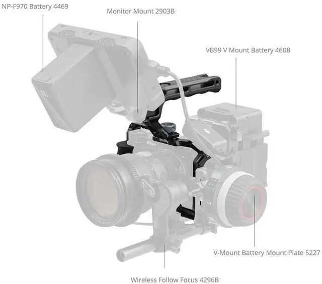 The cage offers extensive expansion options, including multiple 1/4"-20 threaded holes and locating holes for attaching accessories such as side handles (ID 5532) or magic arms (ID 5308, 4900). It also features 3/8"-16 ARRI locating holes for mounting monitor mounts (ID 2903B) or top handles (ID 5252, 3765). Built-in cold shoe mounts allow for the attachment of microphones (compatible with DJI MIC 2) or lights (ID 4660), while the bottom QD socket supports QD shoulder straps (ID 4118B). Additionally, strap slots accommodate wrist straps (ID 3848) or shoulder straps (ID 4882, 5208).