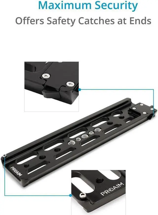 The meticulous machining process ensures a precise and durable product that can withstand the rigors of professional filming environments. The plate's adaptable design is a key feature, boasting multiple 3/8"-16 and 1/4"-20 threaded holes that provide ample options for mounting to tripod plates or ARRI standard plates, including the Proaim 15mm Baseplate, Proaim 19mm Baseplate, or the versatile 19-15mm Baseplate. This flexibility allows for quick and easy transitions between different support setups, saving valuable time on set. For added security, the plate includes a stopper screw at one end and a safety catch at the other, preventing your valuable camera gear from accidental slips or falls during operation.