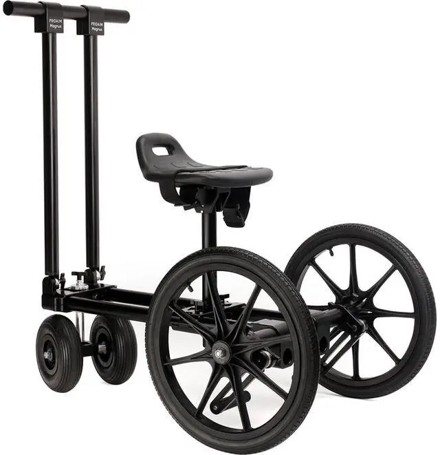 Constructed from solid aluminum, it boasts durability and strength, capable of supporting a payload of up to 150kg/330lb. This fully-featured camera support cart includes a height-adjustable seat with front-to-back positioning and a safety belt, ensuring the operator's security during shoots. The two adjustable footrests are designed to reduce pressure on the operator's legs, providing comfort for long hours of shooting. The adjustable push/pull bar tilts 90 degrees, allowing the grip to maneuver the rickshaw in multiple configurations. The front wheel axle of the Proaim Magnus extends outward for a wider stance, providing stability for different loads.