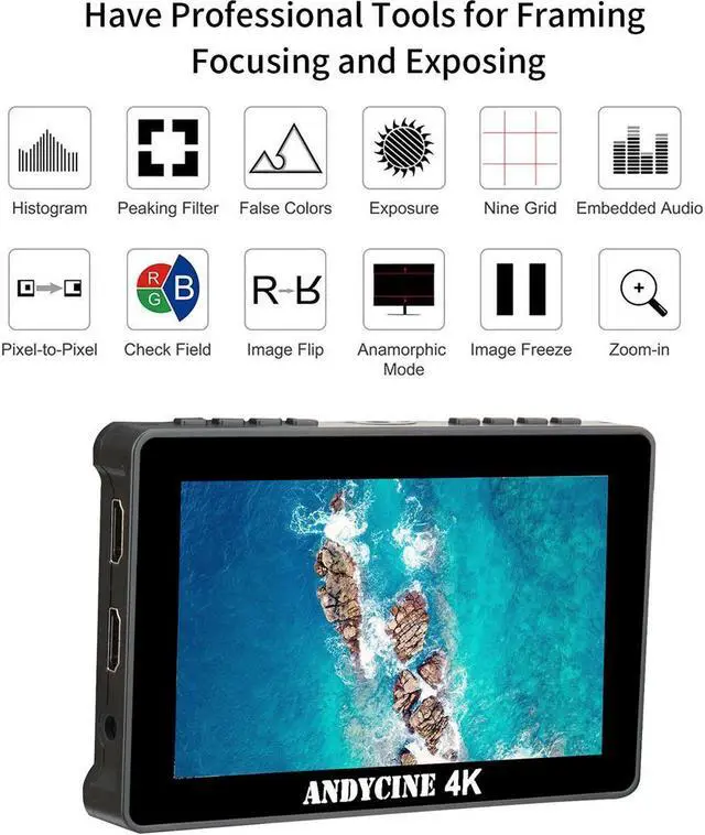 This durable on-camera monitor is equipped with a Sony F970 external install and power kit design at the back, providing a practical solution for attaching additional equipment such as wireless transmitters, LED lights, or video converters. This feature not only saves space but also reduces the weight of your photography gear, making it more portable and convenient to use. Achieve accurate exposure and focus with the A6 Pro's array of useful features. These include 3D Lut, histogram, false color, focus assist, embedded audio, pixel to pixel, frame guides, and a nine-grid system.