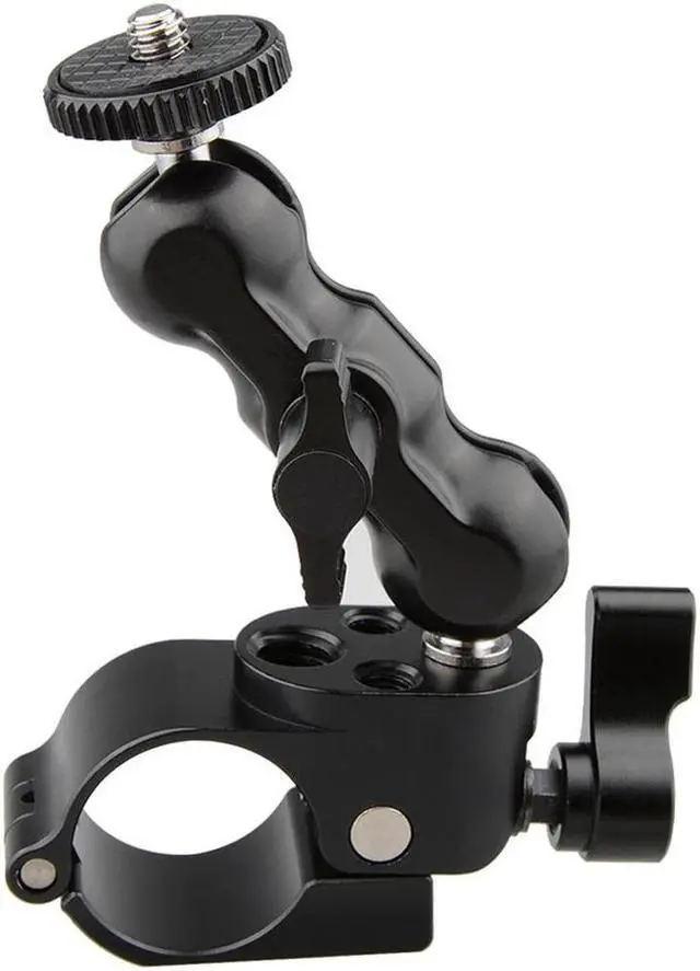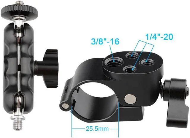 From professional videography to amateur filmmaking, the 1/4" 25mm Rod Clamp 360 Degree Swivel Pea Monitor Mount Adapter with Two Black Knob is a versatile tool designed to enhance your equipment setup. Crafted from high-quality aluminum, this robust adapter is anodized in a sleek, classic black finish, ensuring durability and longevity. Engineered to be universally compatible, this adapter fits all rods ranging from 24.9 mm to 25.5 mm. This broad compatibility makes it an essential addition to any videographer's toolkit, catering to a wide array of equipment configurations. The adapter features three 1/4" and one 3/8" mounting holes on the clamp, providing multiple mounting options for your convenience.