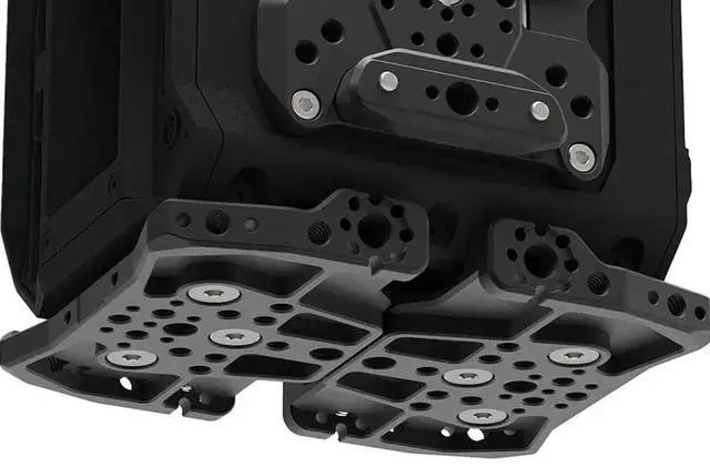 The Side Rails are engineered to accommodate Drop-in filter lens adapters, such as the MOFAGE Poco and Breakthrough Photography DFM adapters. The Side Plate is a powerhouse of options, featuring dual cold shoes, anti-twist mounts, a removable safety-pin NATO, and an in-line bubble level. It can be mounted with the NATO rail at the top or bottom, and the rail can be removed to allow tripod plates to be attached in either orientation for vertical shooting. The mounting row is precisely centered with the sensor, ensuring consistent parallax when used on a gimbal or tripod.