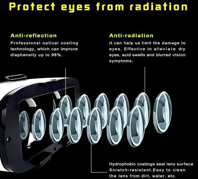 EYE PROTECTION HD LENSES: The VR Glasses headset features anti-reflective and anti-blue light coated lenses to prevent eye strain when using the headset. In addition, aspherical and anti-distortion lens surfaces allow for clear, high-definition images.
