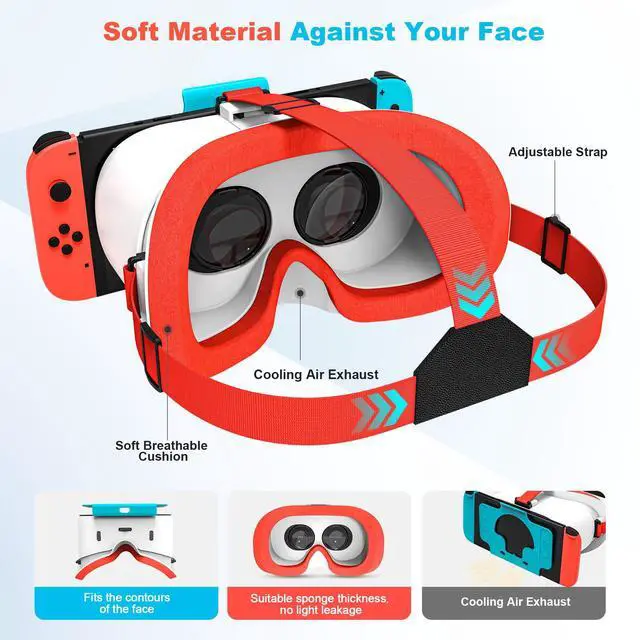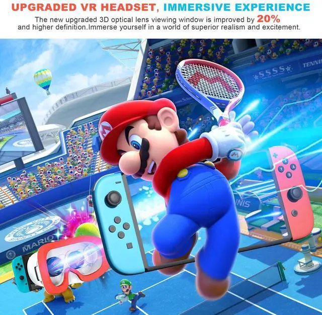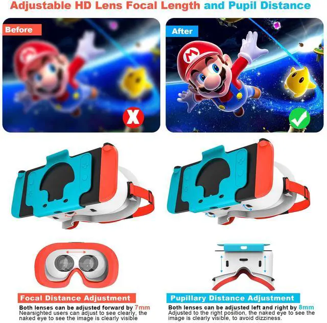 Fully upgraded VR glassesThe Switch VR headset has upgraded adjustable lenses that increase the window of view by 20 percent and provide greater clarity. You can easily adjust the Switch's left, right, front, and rear lenses to ensure perfect image alignment and an immersive visual experience. For a truly immersive gaming experience that frees up your hands and lets you enjoy the virtual world to the fullest.