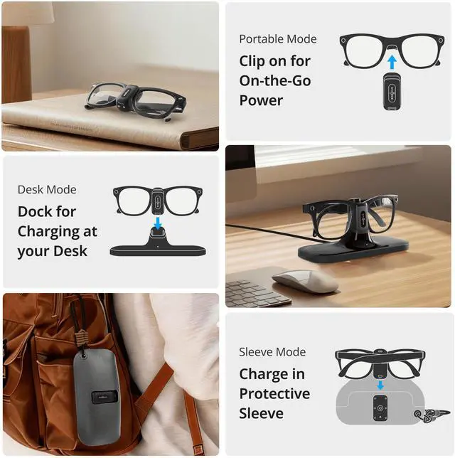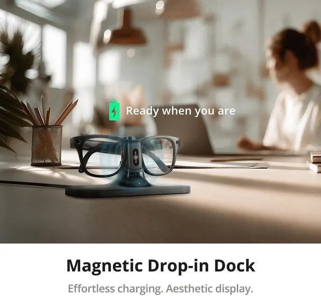 The modular base uses magnetic alignment for an effortless "drop-and-charge" experience. Simply place the glasses (with the battery clip attached) onto the dock to start charging automatically. Whether you use the USB-C cable directly or the dock, the charging performance remains consistent, giving you flexible options for home or office.