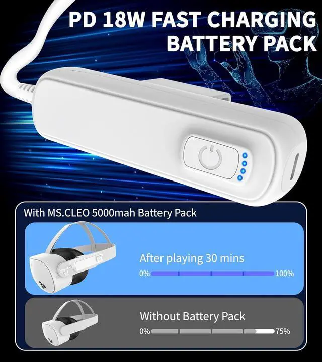 Extended VR Playtime Anywhere: Equipped with a 5000mAh rechargeable battery, it can extend your Meta Quest 3/3S/2 gameplay by 24 hours.Let you enjoy uninterrupted gaming experience and solve battery anxiety when traveling or exercising